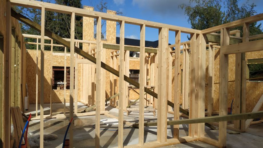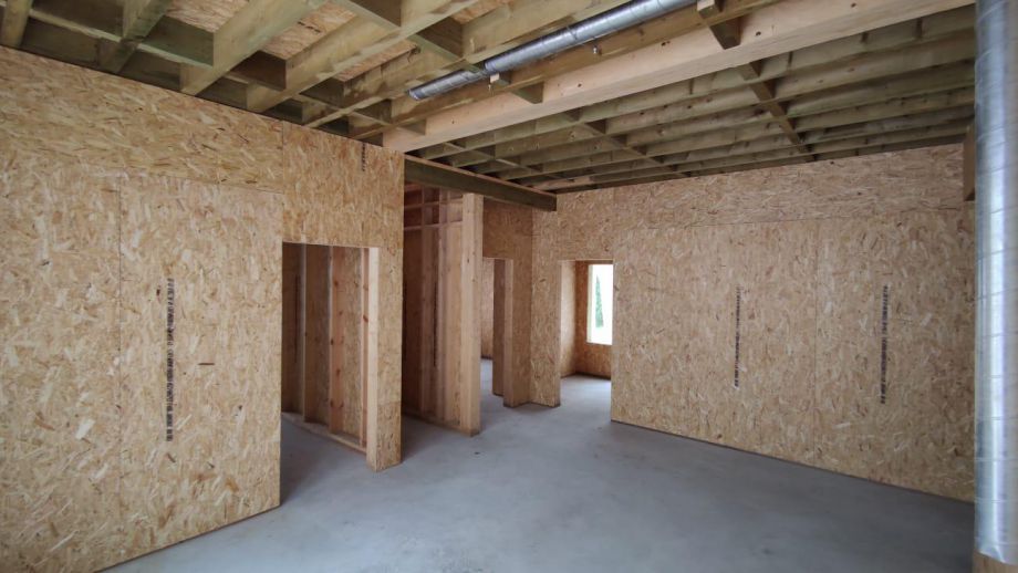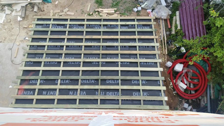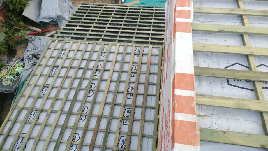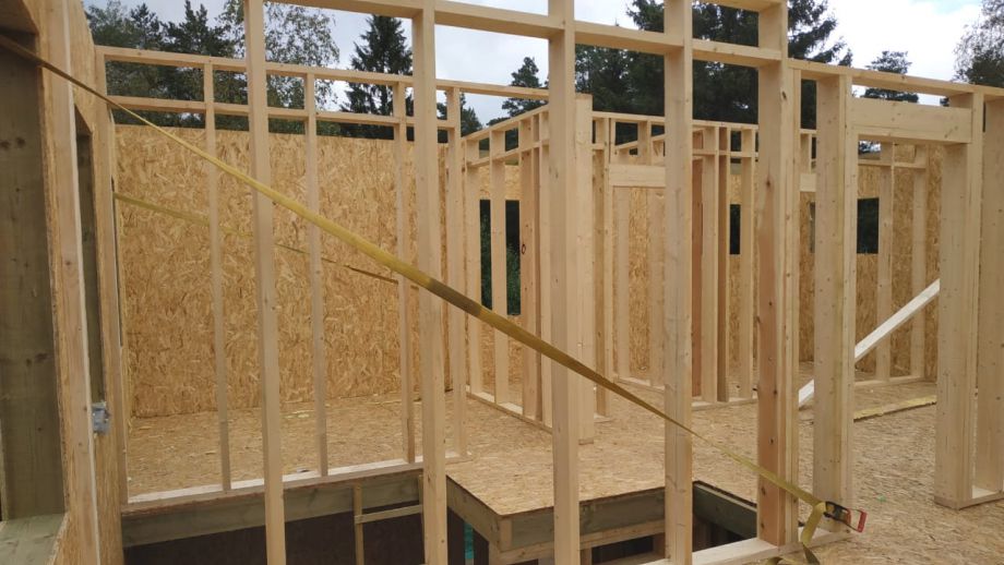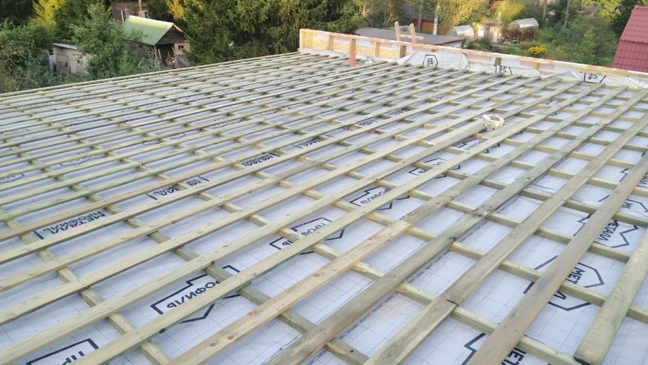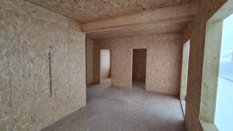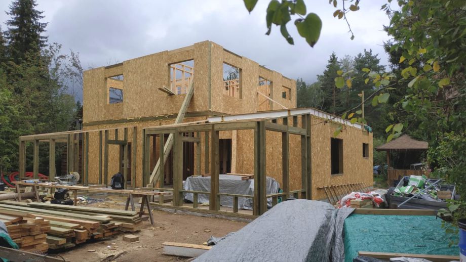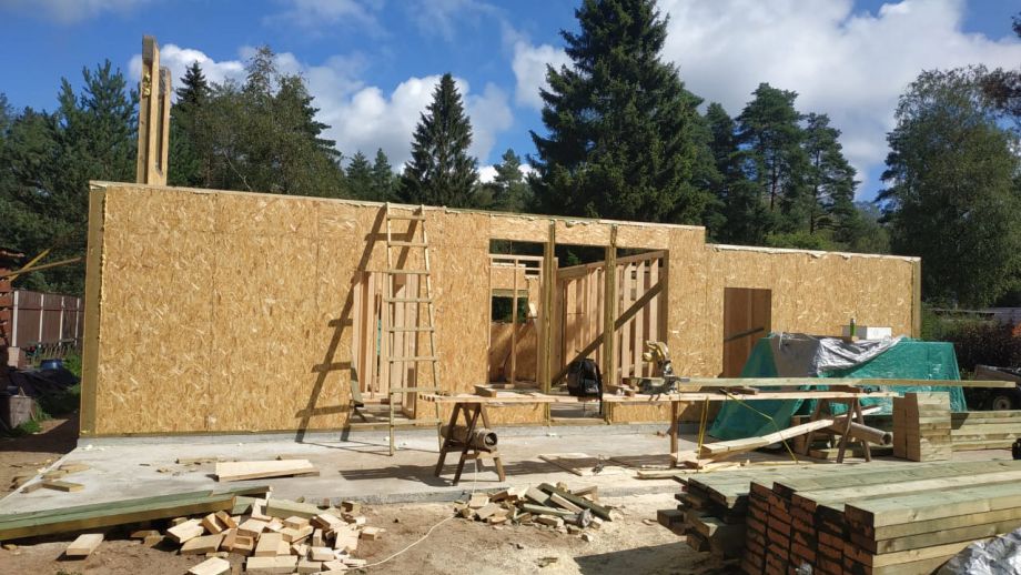 Кровля холодная односкатная, с парапетами и малым углом наклона. Фасад здесь будет из брашированной доски, сейчас ждем его готовности.