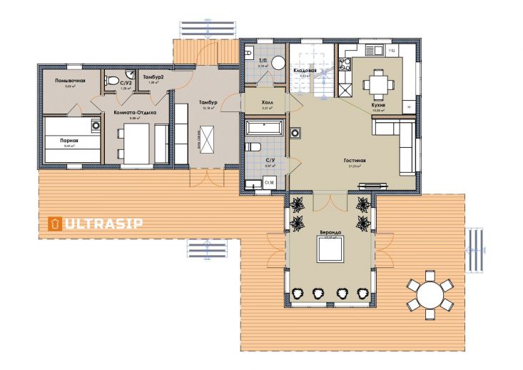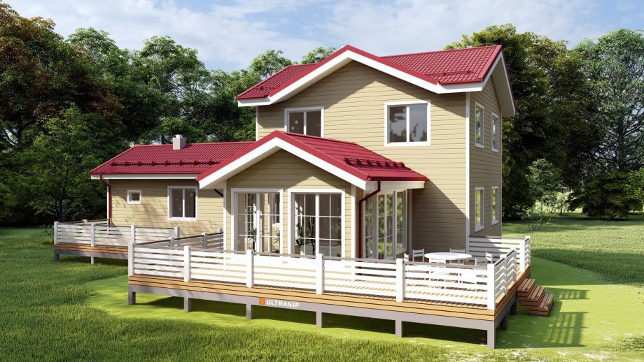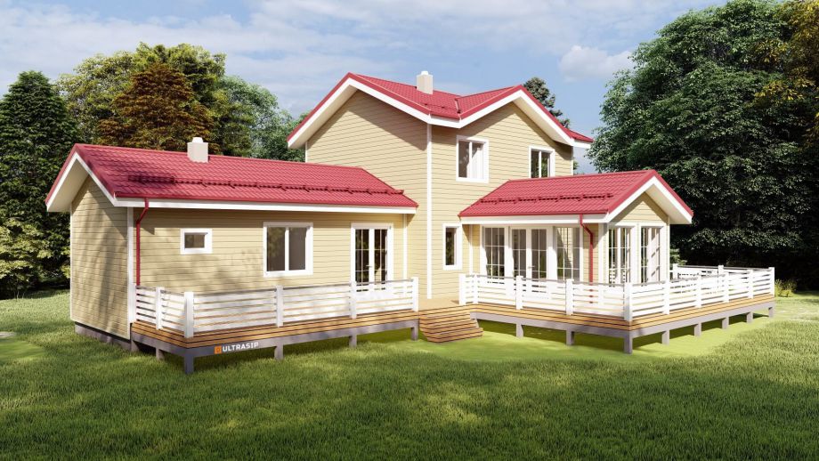 Итак - встроенная баня в отдельном крыле дома, зимний сад и громадная, площадью 70м2., терраса - это отличительные особенности этого дома.